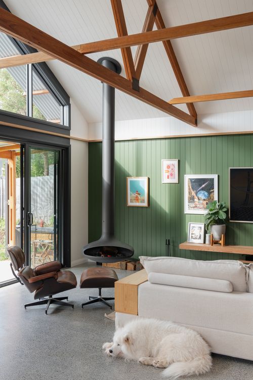 A veranda-style awning wraps the north-western side of the house, tempering the coastal sun while creating a relaxed edge condition. Deep eaves provide further solar control, balancing shade and light across the interior. Inside, the aesthetic continues seamlessly—hardwood is carried through as cladding and detailing, paired with polished concrete floors. The concrete serves not only as a robust surface but also as a source of thermal mass, regulating internal temperatures naturally.